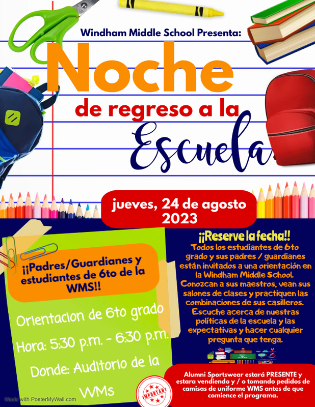 Esperamos que estĆ©n teniendo un verano increĆble. Queremos invitar a todos nuestros estudiantes de 6to grado junto con sus padres/tutores a nuestra Noche de Regreso a la Escuela/Noche de orientación.